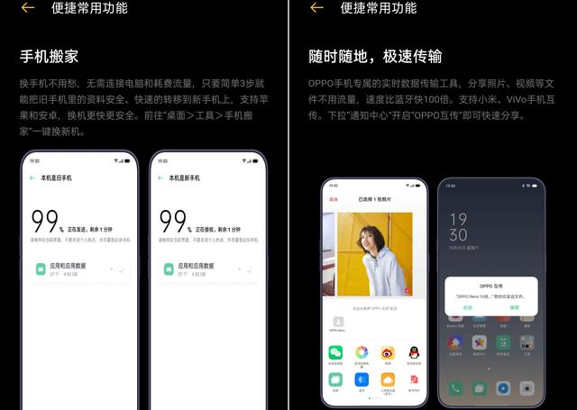 很多时候我们会出现手机和手机之间的文件互传需求,对于别的手机品牌都是通过临时安装第三方软件实现。OPPO手机在系统自带的程序中加入了一个新旧手机一键搬家功能,以及文件互传设计的专属APP,可以实现跨平台手机文件传输,还可以用于新旧手机之间的快速信息交换,可以说实用性很强。