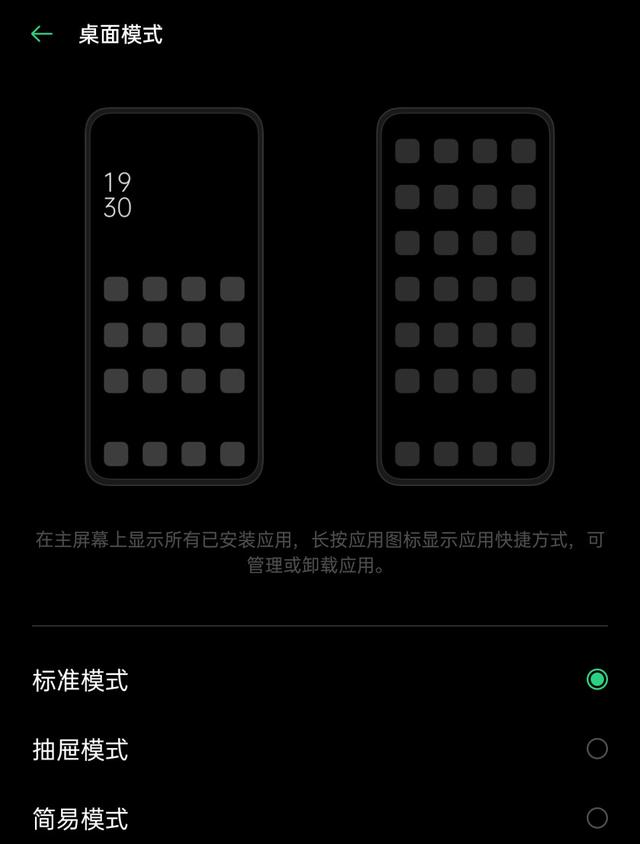升级后桌面可以选择为抽屉桌面,简易桌面模式,选择后可以简化整体布置,并且桌面图标更大,桌面布局更简单直观;这一技巧可以让手机变得更像是老人机玩法。同时还新增了在主界面下下滑后启动全局搜索或者信息中心的玩法。