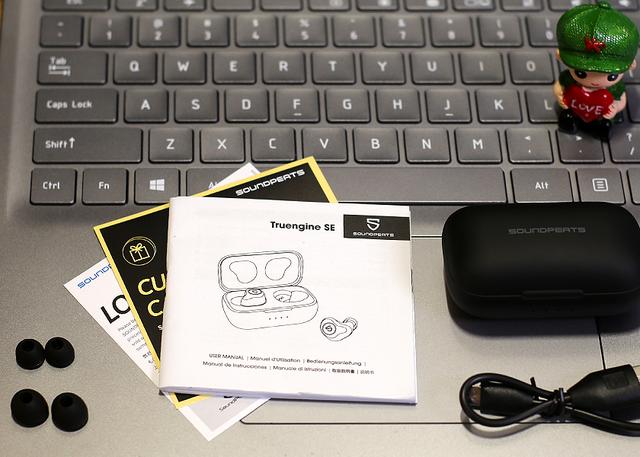 这款TRUENGINE SE耳机配件还挺齐全,有额外两对不同尺寸的耳帽,适合不同耳廓大小的人群。另外还有一条充电线,以及传统说明书!还带有保修卡和用户手册