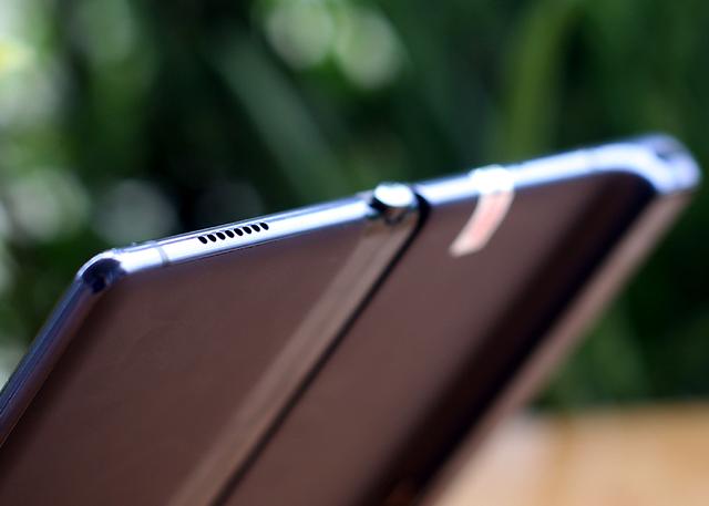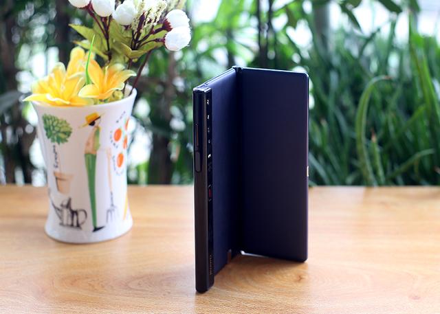 展开后的机身底部侧边细节,最薄处仅仅5毫米左右。这里带有扬声器,声音还是颇为洪亮清晰。