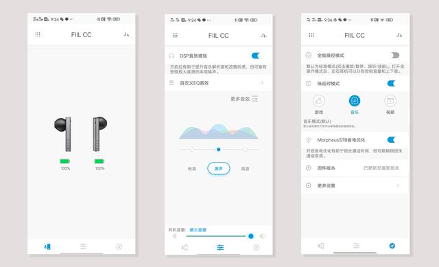 FIIL CC还有更多的玩法等待着我们去发现,去挖掘,我们只需要下载FIIL+软件,就可以对耳机进行多样化的设置操作,软件的一页显示的是左右耳机当前的电量,第二页则是对耳机音质的控制,这里有DSP音质增强开关和10段自定义EQ音效,同时还可以控制增强耳机的高低音和调节耳机音量,在软件的第三页可以切换耳机的操作模式和进行固件升级,除此之外FIIL还专门针对不同使用场景开发了低延迟模式,在低延迟模式下又分游戏模式、音乐模式和视频模式3种模式,我们根据不同的使用场景选择不同的模式,可以获得更好的体验。