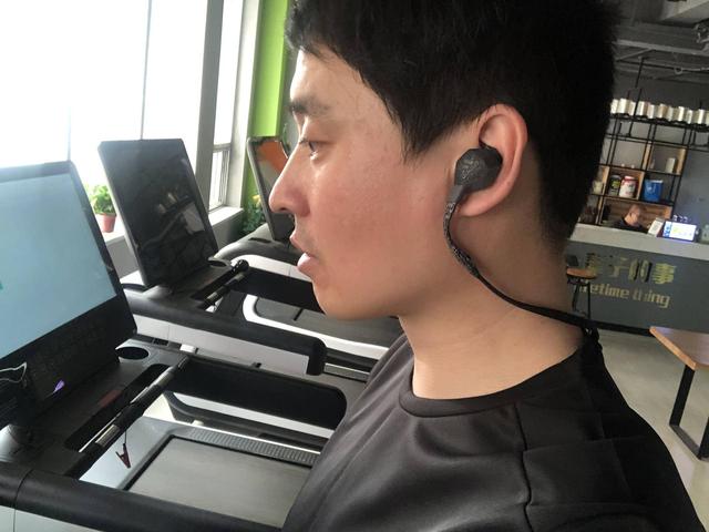 照片我拍了很多,为了能多几个角度来展示耳机的在运动中的状态。由于耳机自带了鲨鱼鳍耳帽,在适宜温度(25℃)下的运动不会汗如泉涌,所以牢固度在多数情况下是可靠的。耳机在暂停状态下,还可以通过磁吸设置,固定在胸口位置。