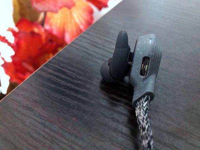 右侧耳机的下方设置的是耳机的充电接口,从这个角度也能看出来,耳机的体积有点儿大。