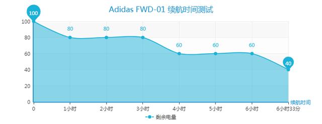 官方标称Adidas FWD-01拥有16个小时的单次续航时间,这个时间实在是太长了,我无法连续16个小时来持续测试它,所以我截取了6个小时的电量测试数据,来一个管中窥豹。实际上6小时的连续续航时间,已经足够满足大多数人的需求了。