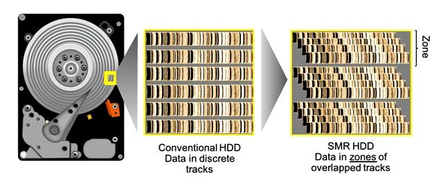 空盘状态下(初次写入)二者的性能差别不大,但是覆写状态下,由于SMR需要同时改动临近的磁道数据,执行擦除再写回的方式,导致了磁盘工作量加大,而且磁头也必定会更加频繁执行读写操作,也变相的降低了磁盘的使用寿命。这就是相对PMR来说,SMR硬盘最大的缺点。