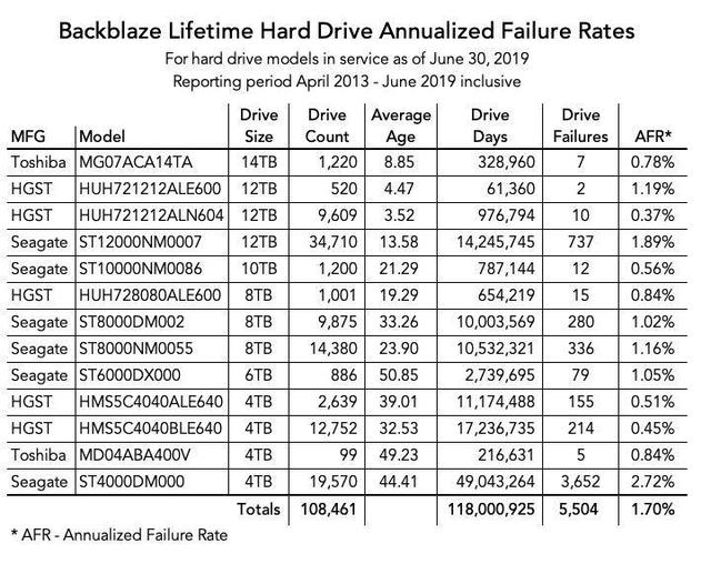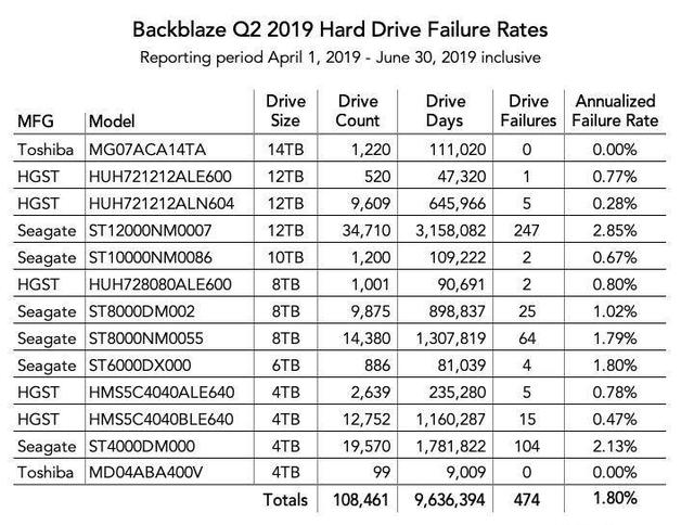 “好”这个词很笼统,性能大家都差不多,主要看故障率了,下面是数据存储厂商Backblaze,发布的2019年度硬盘故障率报告,也许我们可以从中一看端倪。