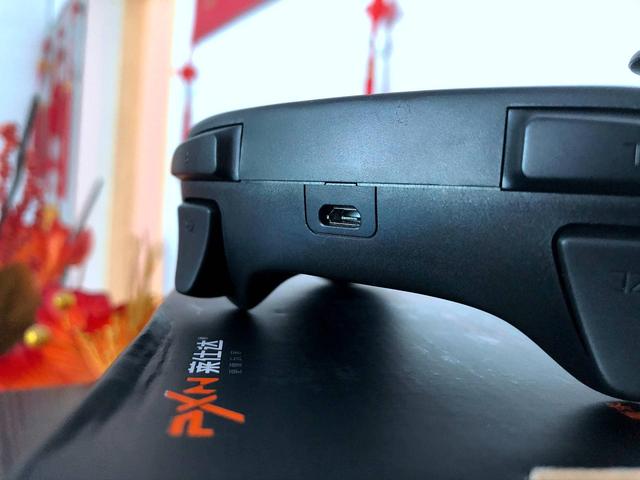 手柄上方的最中间,是USB充电接口,如果能有防尘塞来遮挡一下会更好。