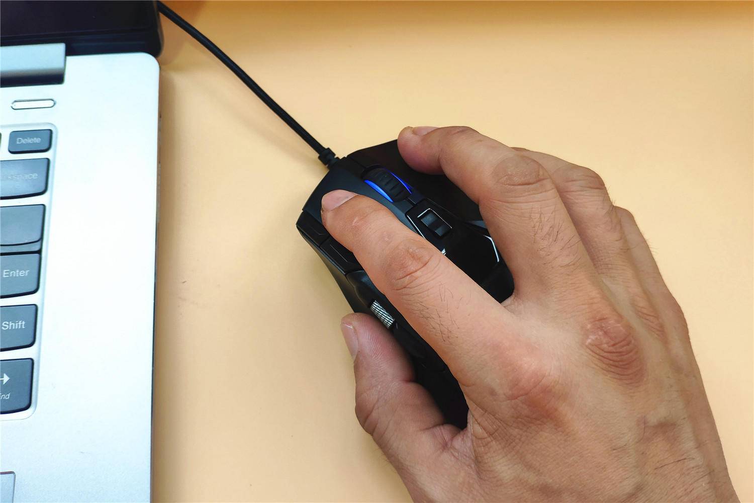 握持鼠标,雷柏V300能很自然的托起掌心,降低手部用力,让人明显有很舒适的感觉,而且因为整体质量很轻,通过大小拇指即可轻松移动或抬起鼠标,如此能降低操作疲劳感。