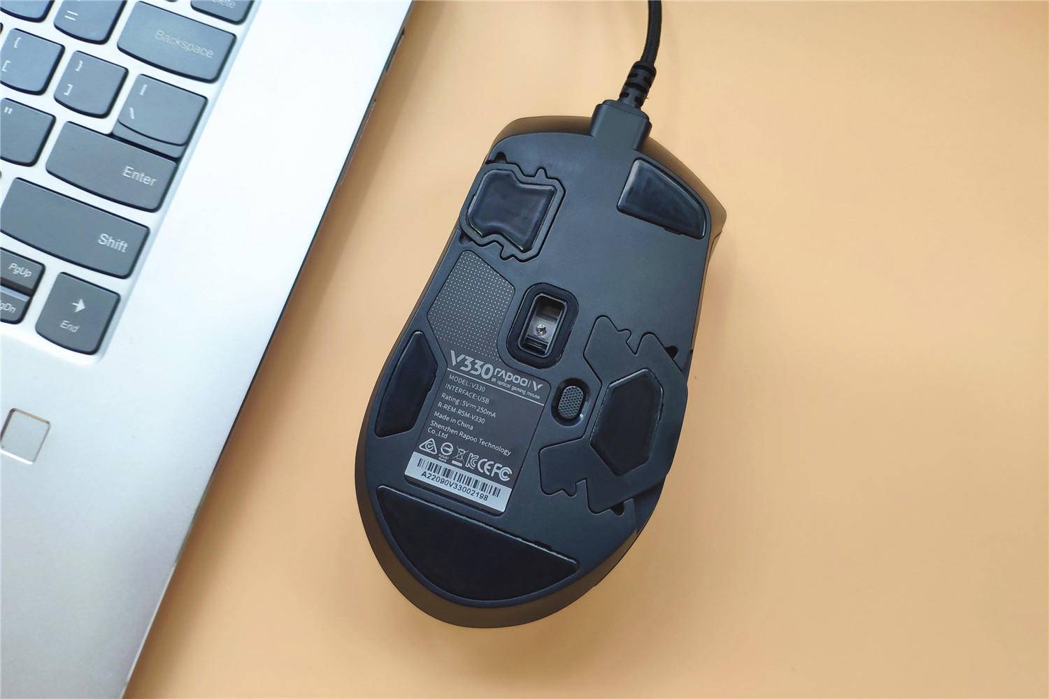 到了展示环节,作为游戏鼠标当然要有炫酷的背光系统,雷柏V330不仅有背光,而且是三区域背光,包括滚轮内、正面LOGO、底部后侧围,看上去更加夺目,而且雷柏V330采用的是1680万色RGB背光系统,支持上千万种配色哦。