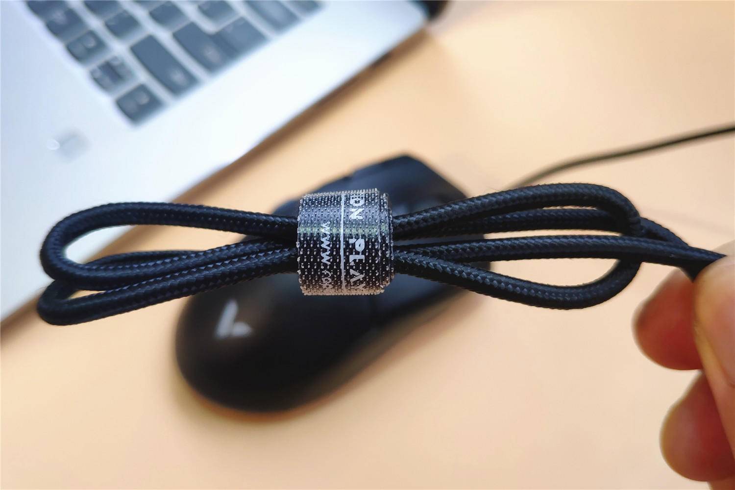 鼠标线长约2米,完全能够满足我们的日常使用需求,而且线材上还有定制的捆绑条,可以选择性捆绑部分线材,达到更适合的使用长度;鼠标线采用了尼龙编制外皮,更加坚固且耐用。