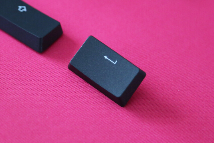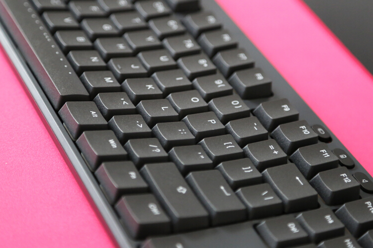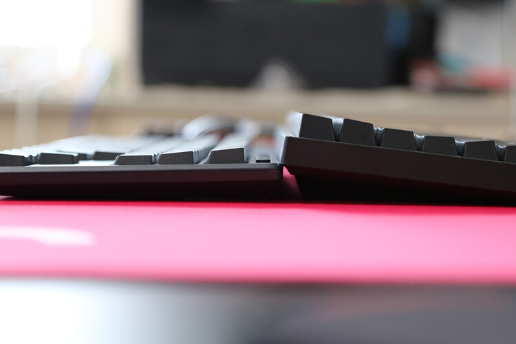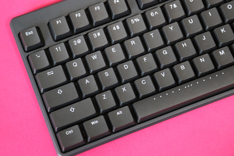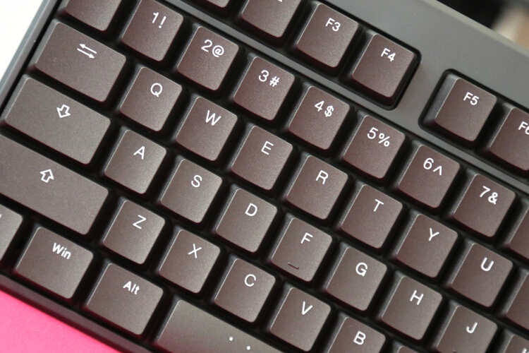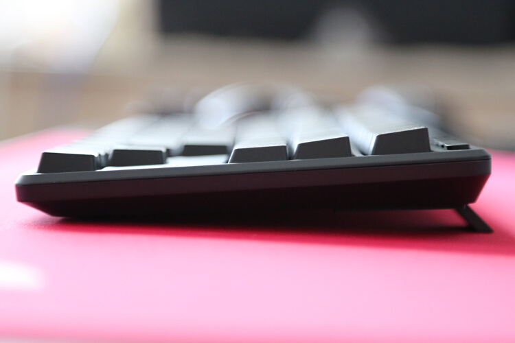 键帽为PBT双色注塑,做工、厚度、硬度都不错,耐磨性毋庸置疑,虽然是超薄键帽,但还是做了阶梯高度,符合人体工学。