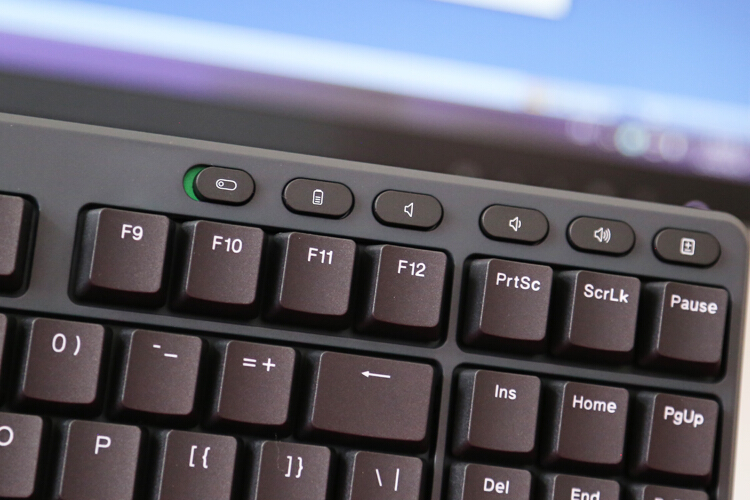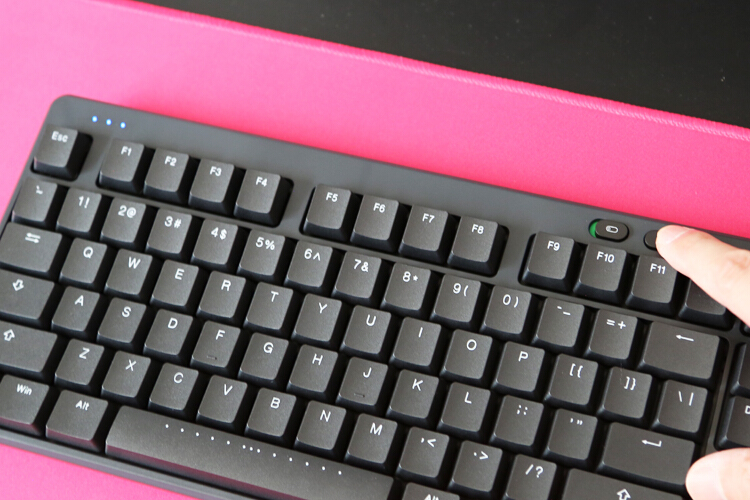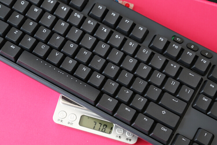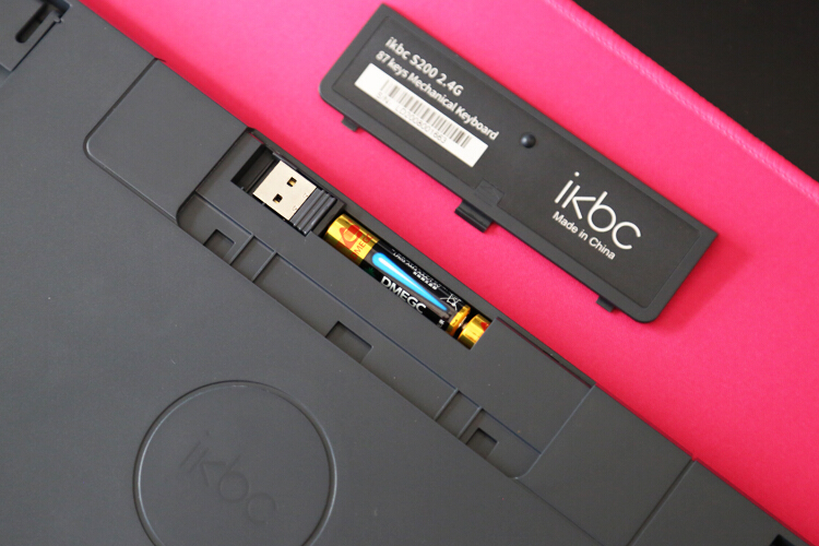 键盘仅支持2.4g无线连接,安装两枚7号电池供电,顶部为电池仓和2.4g接收器收纳仓,续航时间官方测试为每日8小时,持续6个月。按下电量指示键后左边闪烁显示剩余电量。
