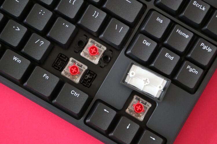 大键卫星轴设计,由于大小写锁定、回车等按键长度非常规配列,ikbc为此设计了键帽定位柱,稳定性和顺滑度都非常nice,但想换个性键帽会很难,不过矮轴嘛也就别想太多了。