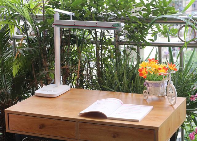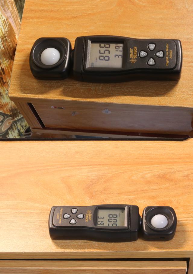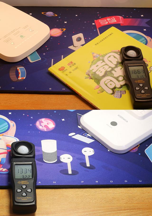 使用台灯的学习专用光亮度后,通过亮度表进行测试,在环境自然光亮度220的前提下,在台灯距离书本40厘米的高度情况下,桌面中心位置摆放的书本亮度在818水平。