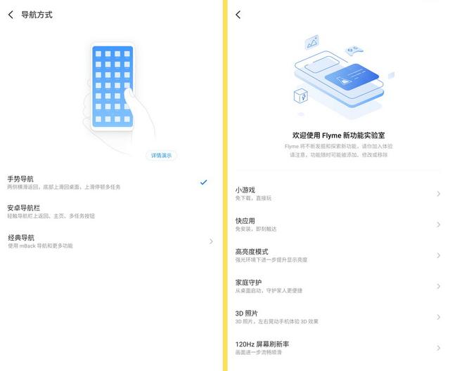 在屏幕右下角下滑,可打开Flyme 8的应用小窗,快速打开应用,扩展了小窗菜单,允许添加24个应用,而且支持拖动排序。操作方面魅族的Flyme 8通过手势实现操作,左右滑动返回上一层,上滑悬停多任务,这种操作方式都非常熟悉易上手。系统中增加了新功能实验室,内里带有免下载直接玩的小游戏,免安装直接用的快应用,让手机在阳光下更清晰的高亮度模式,家庭守护安全选项,3D动态照片的拍摄,以及开启120Hz屏幕高刷新。