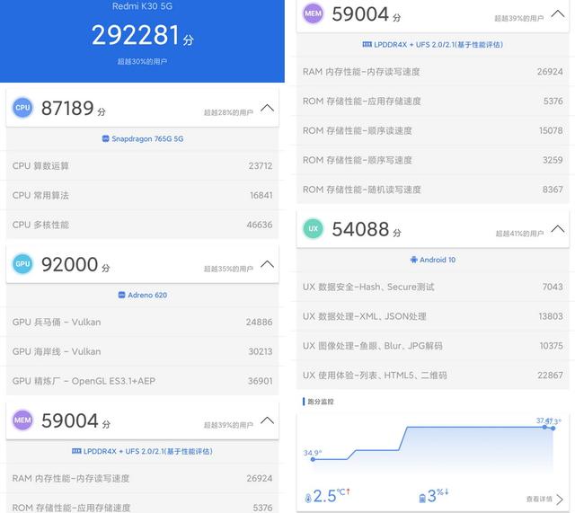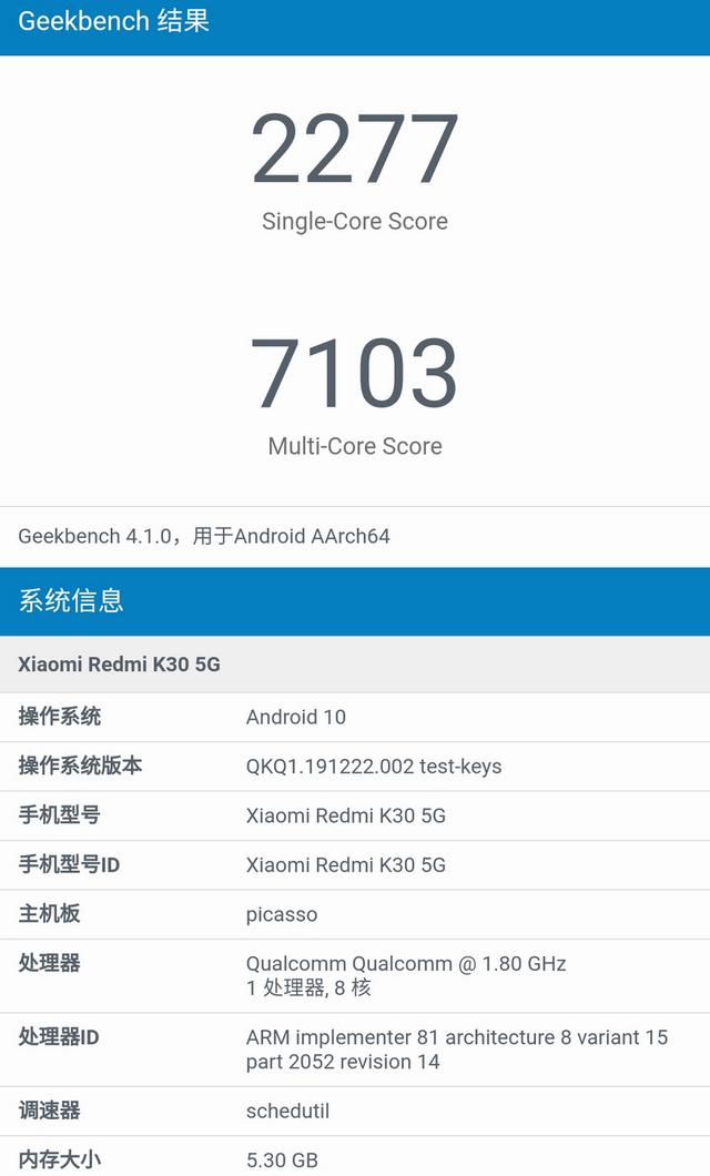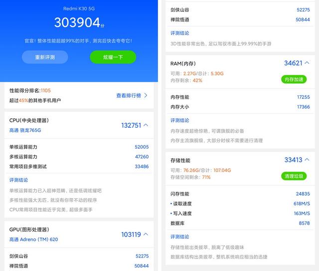 我选择的这款Redmi K30 5G手机采用的是高通骁龙765G Soc,7nm EUV工艺,集成骁龙X52调制解调器及射频系统,支持SA+NSA 5G双模组网,目前来看它基本上是目前中低档位的5G手机中最常见的一款芯片搭配,CPU为一颗2.4GHz的超级大核,一颗2.2GHz的性能核心,六颗1.8GHz效率核心,GPU为 Adreno 620。我选择的是6GB内存搭配128GB储存的时光独白款式。