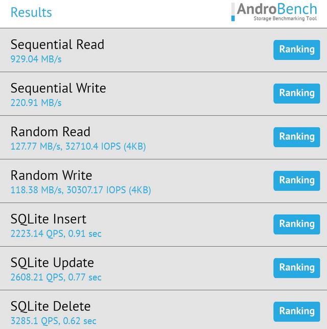 先来看看内置储存,AndroBench是一个基准测试应用,可以测量Android设备的4K