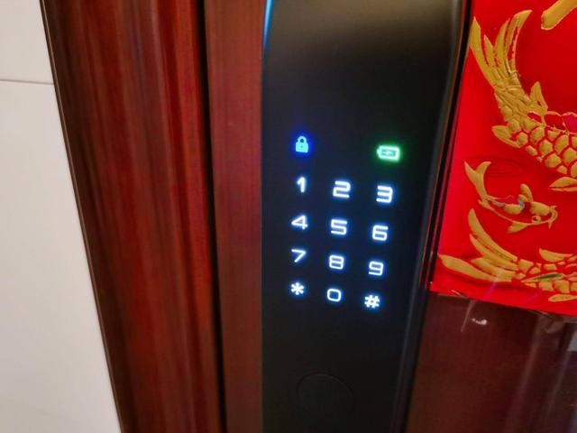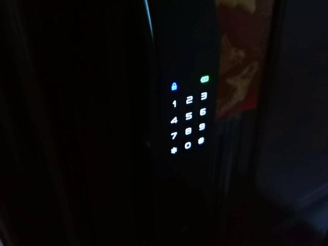 安装完成后有多重的体验等着我,首先是密码输入。德施曼小嘀 Q3H智能指纹锁的触控界面是有背光的,平时看不出,只要手轻触触控区就能启动背光,输入密码了。触控区左上角的小锁头的按钮是手动上锁的按键,开门时尽量不要误触这里,不然小嘀会自动上锁导致关不上门。