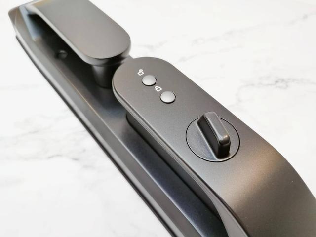德施曼小嘀 Q3H智能指纹锁内门锁同样跟外门锁的设计类似,下方多了三个按钮,分别是自动开、关锁的按钮,此外还有一个旋钮是在室内反锁的旋钮。