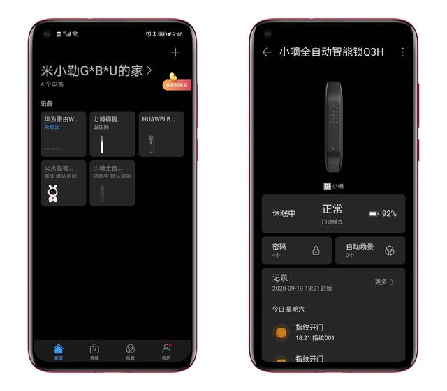 在华为智慧生活APP中点击添加根据提示就能添加门锁了,进入小嘀的界面可以看到门锁目前的使用状态、电池的电量、开锁的指纹密码数量。