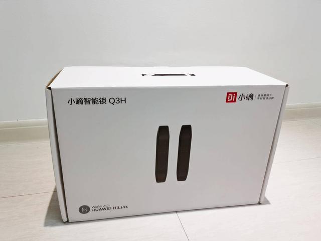 德施曼小嘀 Q3H智能指纹锁的包装还是很结实的,毕竟指纹锁这类产品都很重的。但是我也能感受到德施曼小嘀 Q3H智能指纹锁用料很足,因为我把它从快递站拿回来的时候感觉真的很重。外包装非常简单,上方有个把手方便提拿。包装上有门锁的两种颜色的形象外观和门锁名称。同时我们能注意到它是可以支持华为hilink的。