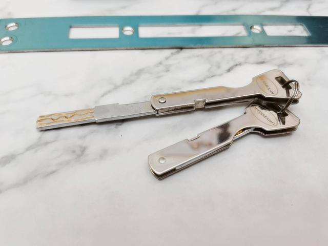 德施曼小嘀 Q3H智能指纹锁的钥匙很漂亮,弯折的设计、全金属的外壳看起来很高档。不过这个就是个放在车里的备用钥匙,是用不到的。