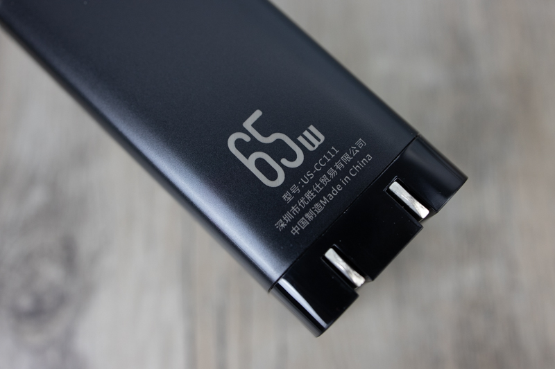 优胜仕65W氮化镓充电器的插头是折叠式的,我觉得这个设计很不错,比如出差的时候放进包包里,就不会划伤表面脆弱的物品了。