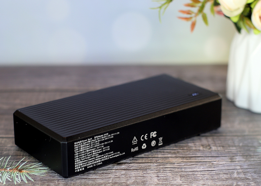 充电宝的尺寸为165.5mm*80mm*32.5mm,体积不算小。外壳上带有条纹纹理设计,不易沾染指纹,也相对抗污耐磨,具有黑色与白色两款不同色彩可以选择,都颇为商务化搭配。侧边带有产品的主要参数,可以实现5V,9V12V等多类型电压需求,以实现快充效果。