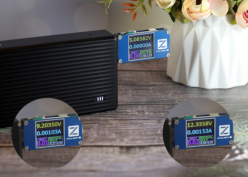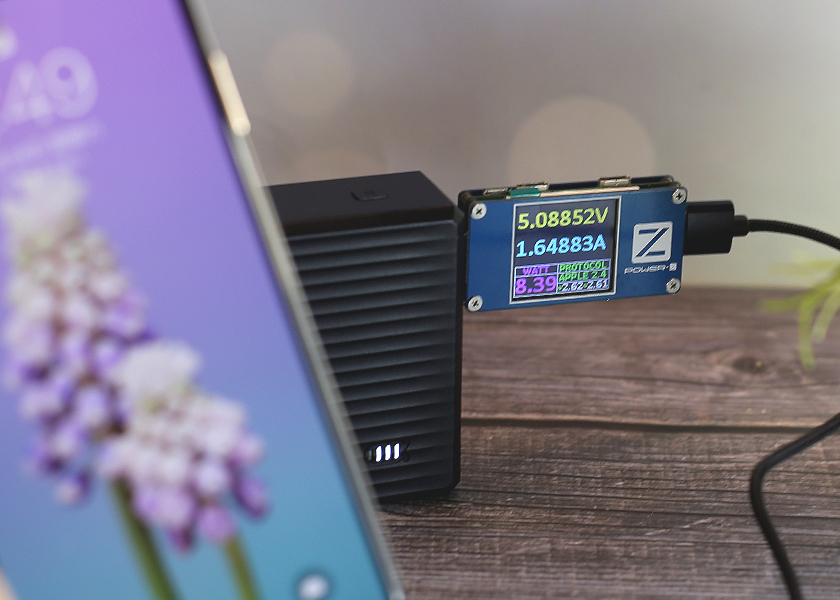 先来看看为充电宝充电的效果,我搭配了一个既支持12V输出又支持9V输出的PD充电器为这款充电宝进行充电,实际充电效果优先为9V1.88A。因为内置了30000毫安时的大容量电池,所以从完全没电到完全充满即使在18W的快充效果下也需要大约11小时的时间。