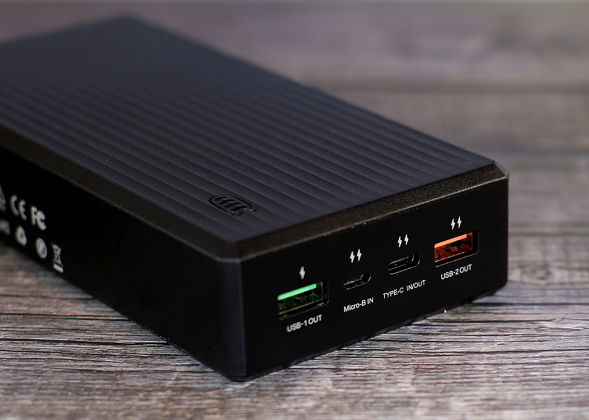 奥睿科30000毫安时充电宝的接口设计得还算不错,用于充电的插口有传统的M-USB插口,以及这个正反可插的Type-C插口。用于输出时,带有一个红色的快充USB输出插口,绿色的普通USB输出插口,正反可插的Type-C插口同时也能用于实现PD快充的输出,这种可以同时搭配三个设备充电的小设计,特别适合我这类多机党和数码玩家的使用需求,显得十分贴心。