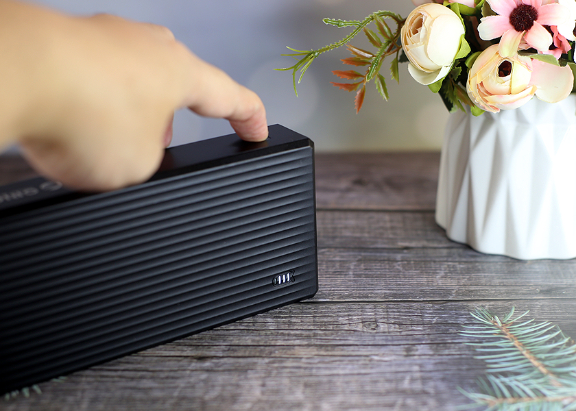 侧边设计带有一个按压式开关按钮,按下后充电宝正面的正面LED电量指示灯就会亮起,采用了传统的格子指示灯设计,用于直观的展示剩余电量。最外侧的指示灯带有不同色彩,可以用于显示快充状态。