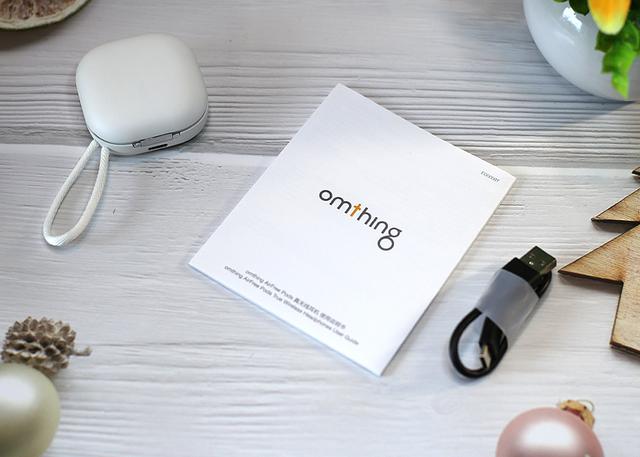 先来看看耳机的充电仓搭配,采用了方形带圆角的设计风格,尺寸仅仅56*56*25mm可以说非常小巧,整体重量也就47克不到,可以说非常便携。纯白色的正面带有反光设计的omthing品牌标示,整体造型圆润精致。