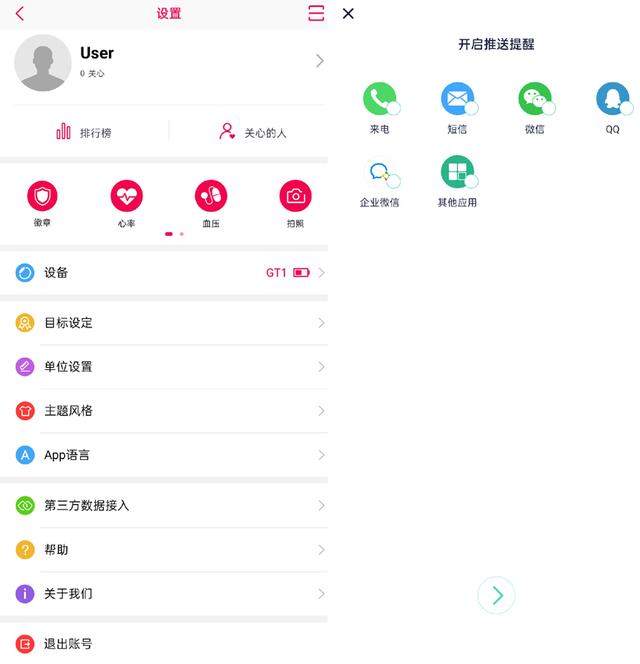 除了常规的运动功能以外,我们还可以在界面中进行简单排行PK,领取徽章奖励,或者实现远程遥控手机拍照等功能。系统设置里还能对APP界面的语言,主体风格等进行设置。除此之外omthing简悦智能手表可以针对主流来电、短信、微信、QQ等信息通知进行推送,方便我们及时获取信息。
