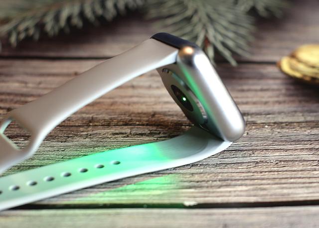 手表背面细节,中心位置为心率和血压传感器,旁边则是磁吸充电的触点。一体式锌合金表壳设计,颇为结实耐磨。