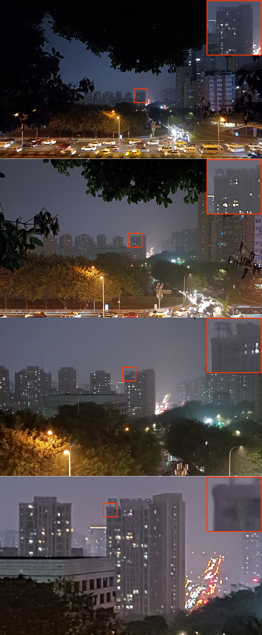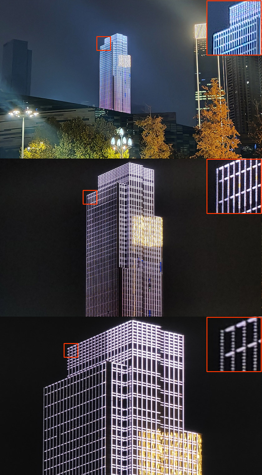 OPPO Reno4 SE 手机的夜景模式模式具有快速多帧合成技术,以及像素优化效果。在较为黑暗的夜晚下拍摄,可以开启脚架模式等设置加强画面质感。下面的画面是在夜景模式下开启广角,1X,2X,5X后拍摄到的画面内容对比。针对夜景来说,因为是多像素合一设计,画面正常观看来说纯净清晰,没有噪点,建筑物边缘锐化,夜景灯光也没有出现晕染现象。不过因为像素多合一技术会导致像素减少,照片放大后的细节会稍有下降,但