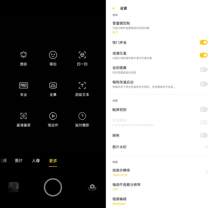 拍照主界面依然还是OPPO品牌的系列风格,选项中保留了闪光灯,HDR,智能模式等选择。拍照功能带有夜景,视频,照片,人像,微距,以及专业模式等。针对用户视频拍摄需求,还搭配带有防抖功能。值得一提的是在OPPO Reno4 SE 手机的人像拍摄模式中,出现了两个比较新奇的新功能。夜景光斑人像功能:可以通过LowLight-HDR、光斑增强、虚化三重算法叠加,使前置的人物画面清晰,而背景完全虚化为光斑,星星点点十分梦幻,从而突出人像本身。人像留色模式:则是让整个画面中只有人像保留色彩,而其余背景幻化为黑白色,整个画面带来更多电影大片感。