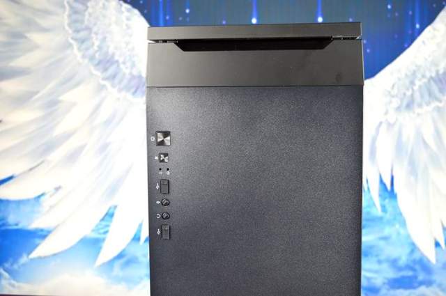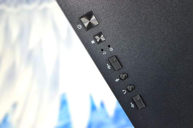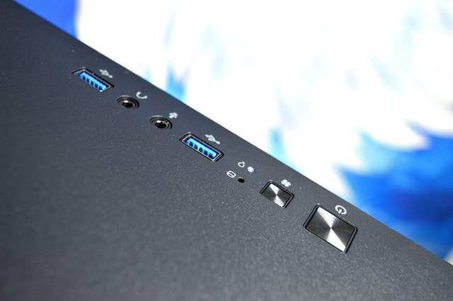 I\O面板在顶面的右侧,依次为开机键、风扇调速键、音频输入\输出、和2个USB3.0接口,中间夹着电源灯和硬盘灯。