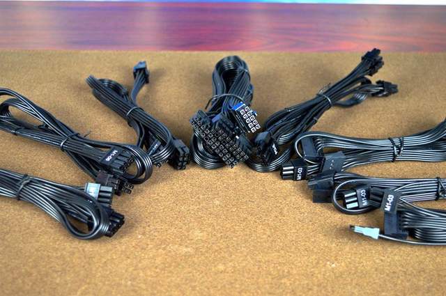 线材很丰富,都是很柔软的扁线,插接轻松便于走线。有24+4针主板线、2根4+4的双头CPU线、2根6+2的双头显卡线、2根4头SATA线和1根3x大4P+1x小4P线。