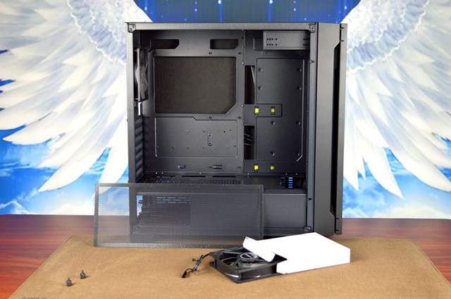 机箱是标准的ATX-Ⅱ结构,电源位与硬盘位合为一体,与高温区分区冷却,但电源位上方很通透,镂空了大面积的散热孔。此处可以安装2把风扇,用于给显卡冷却,赠送的第五把风扇没有安装,就绑在电源位上方,提示需安装在此处,此外这个地方还有一块滤尘网。