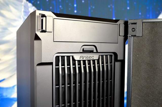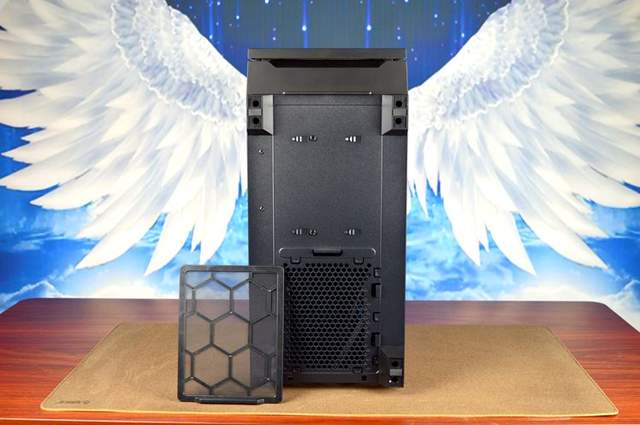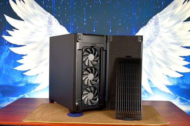 打开前面板之后,机箱就会变成直通风道,最上方还有比较少见的光驱位。面板里面还有一层格栅式隔板,隔板内侧有防尘网。
