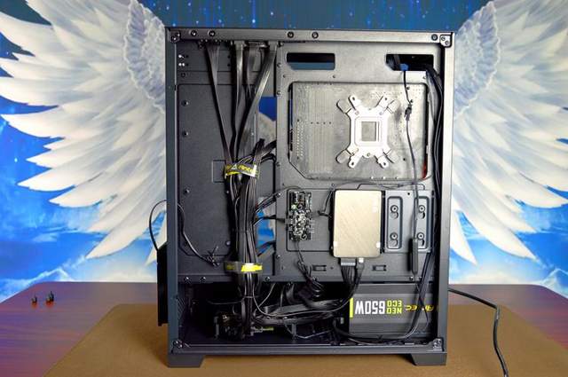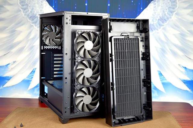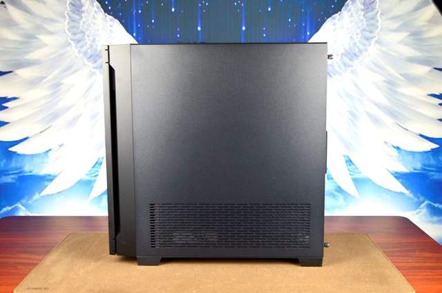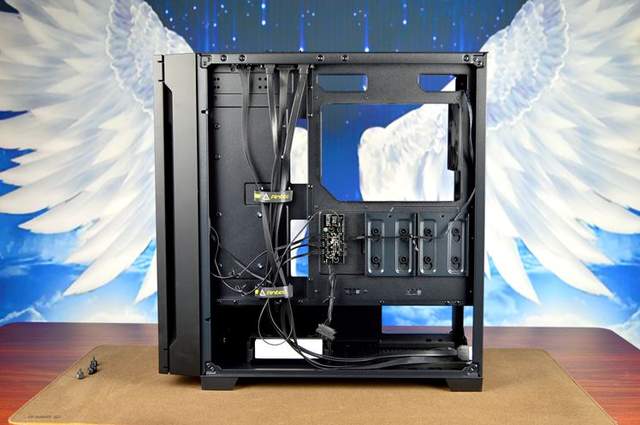 背线有足够的空间来容纳,扣上侧板没有阻隔。侧板下方有一条进风通道,可以在电源位上方安装2把风扇,为显卡提供垂直的冷却气流。