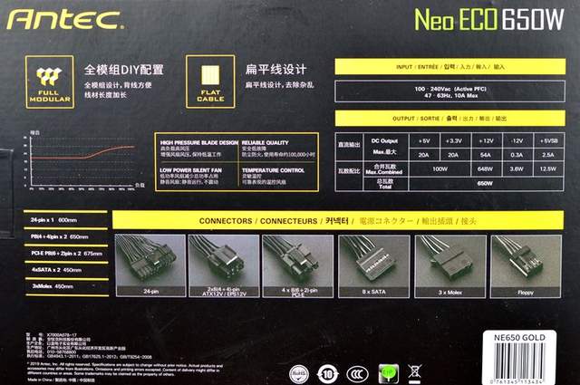 包装背面有产品的详细参数,这款电源经过了80PLUS金牌认证,50%负载下转换效率可达93%,效率非常高。12V输出最大可达648W,支持市面上的旗舰级显卡使用,同时也可供给两个功率较小的显卡交火使用。