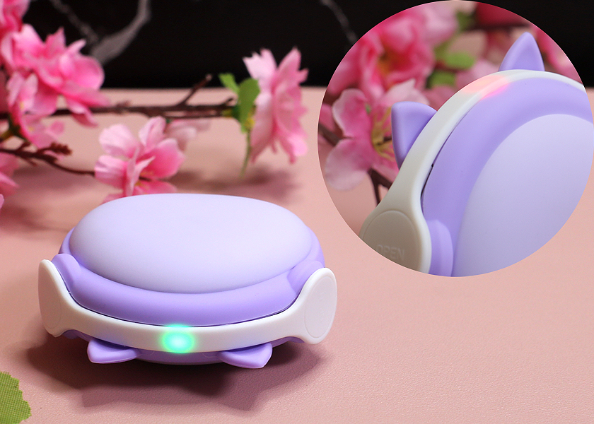 暖手宝的造型就像是头戴耳机的小动物,这块白色耳机形状的设计,一侧为隐藏式充电插口,另一侧则是开关按钮。通过长按开启后,顶部会有指示灯亮起。两档温度设计,分别用绿灯和红灯进行显示,低档模式为绿灯发热稳定在50℃左右,而高档模式下温度会上升至60℃左右,较前面要低档模式明显要热很多,我们可以针对室外环境温度进行选择。比如在气温0-10度时选择低档即可,气温低于0度后选择高档会更舒适。