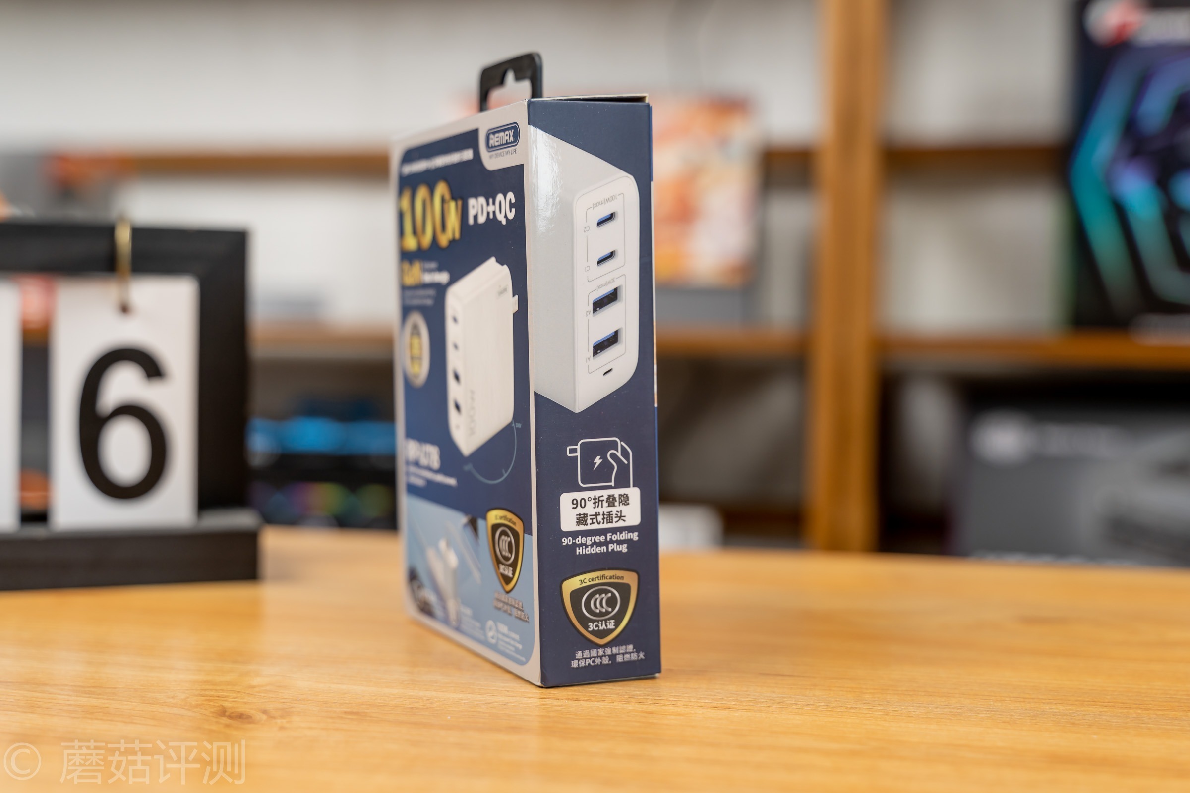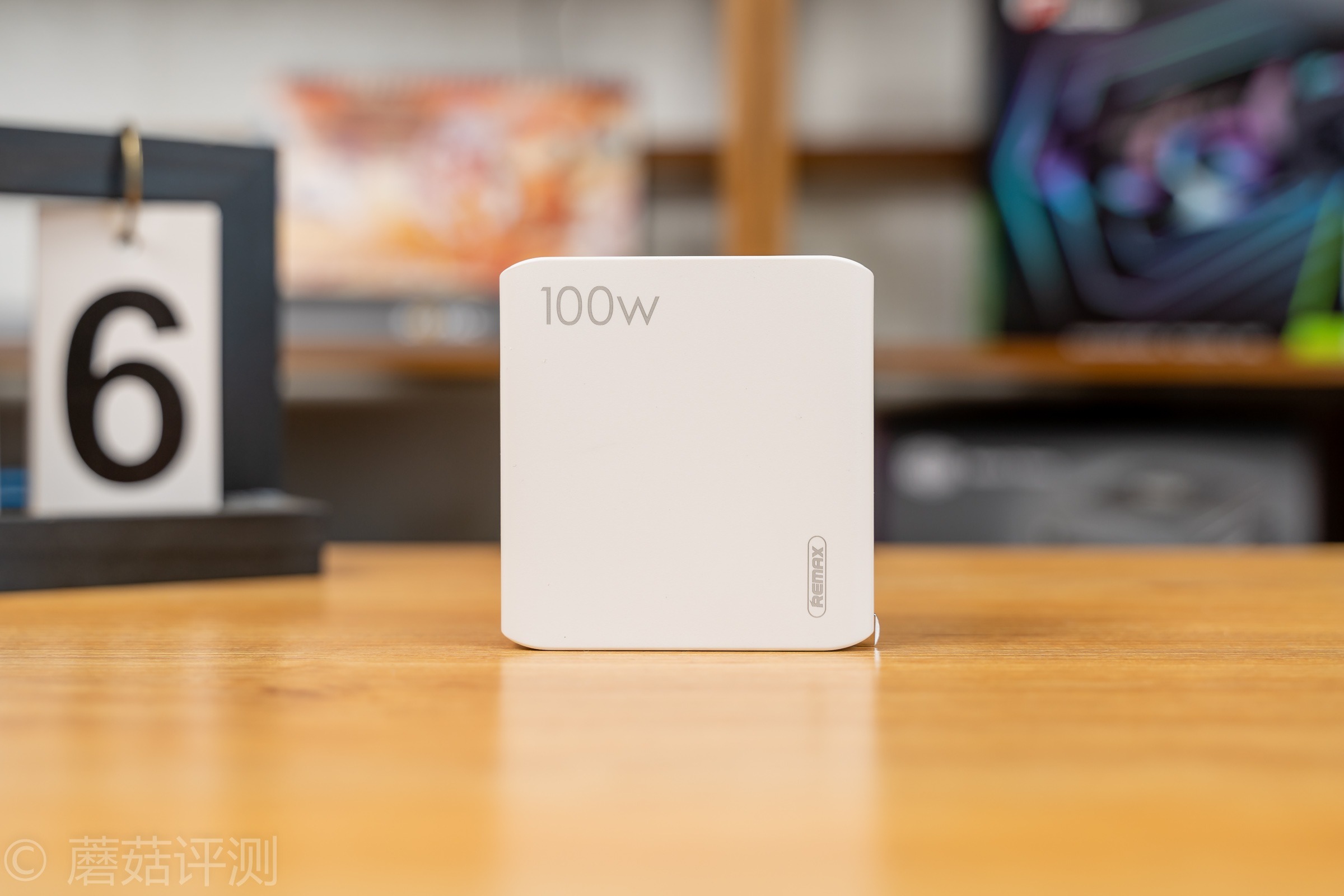 ▼充电器的外形很有意思,正面看并不是传统的正方形,而是类似于圆角矩形的感觉,左上角有100W的字样,右下角有睿量的LOGO。