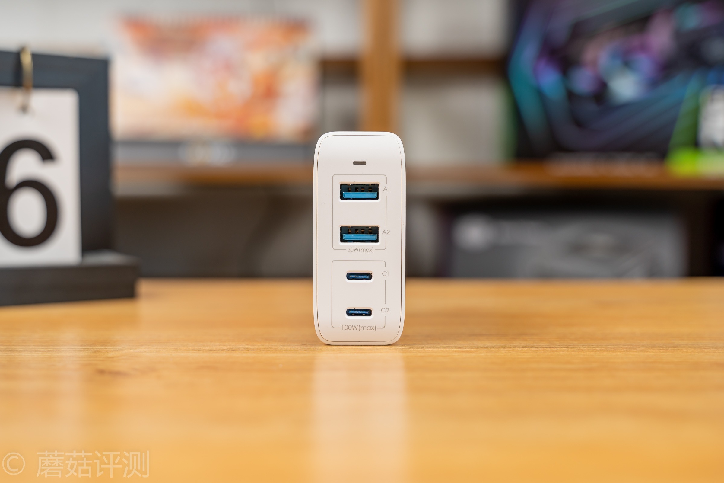 ▼充电器的正面,最顶部有一个指示灯,下面是2A、2C的充电接口。另外可以看到,两个C口最大输出100W,两个A口最大输出30W。