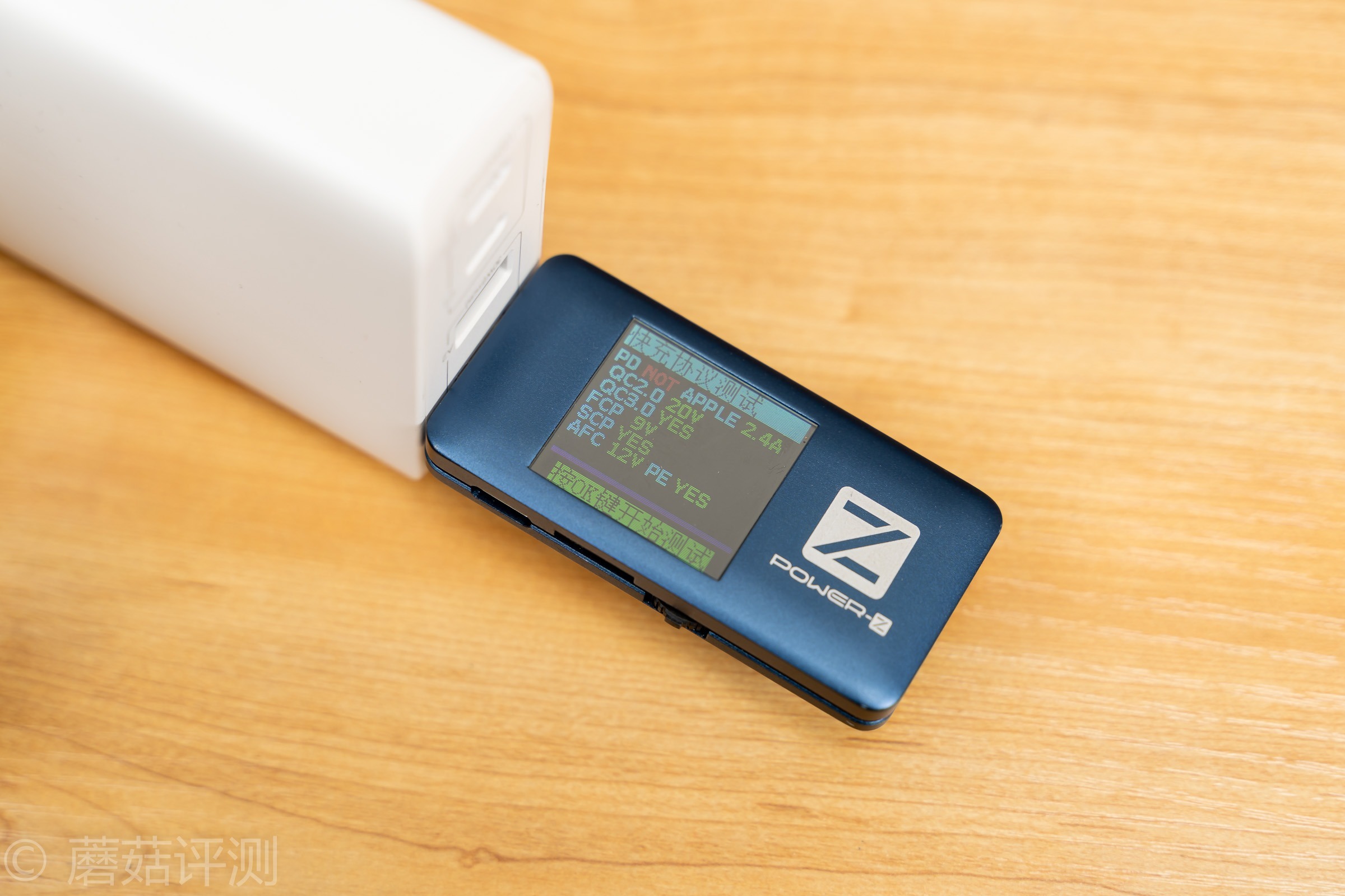 输出测试,蘑菇手头的设备最大仅支持65W输出,实际测试充电头也能满足这个功率输出。另外双C口输出的情况,最大功率在93W左右,达到标称,表现不错。A口两个接口的快充协议的支持也很全面,日常使用会挺轻松的。