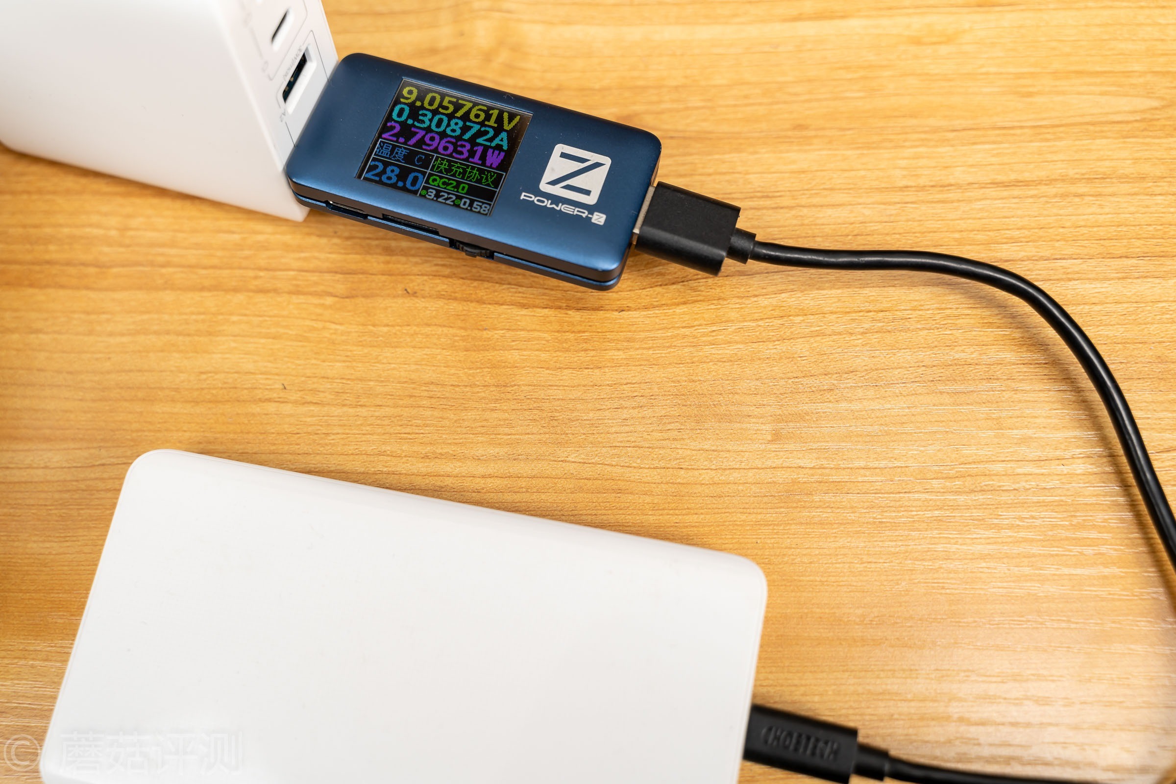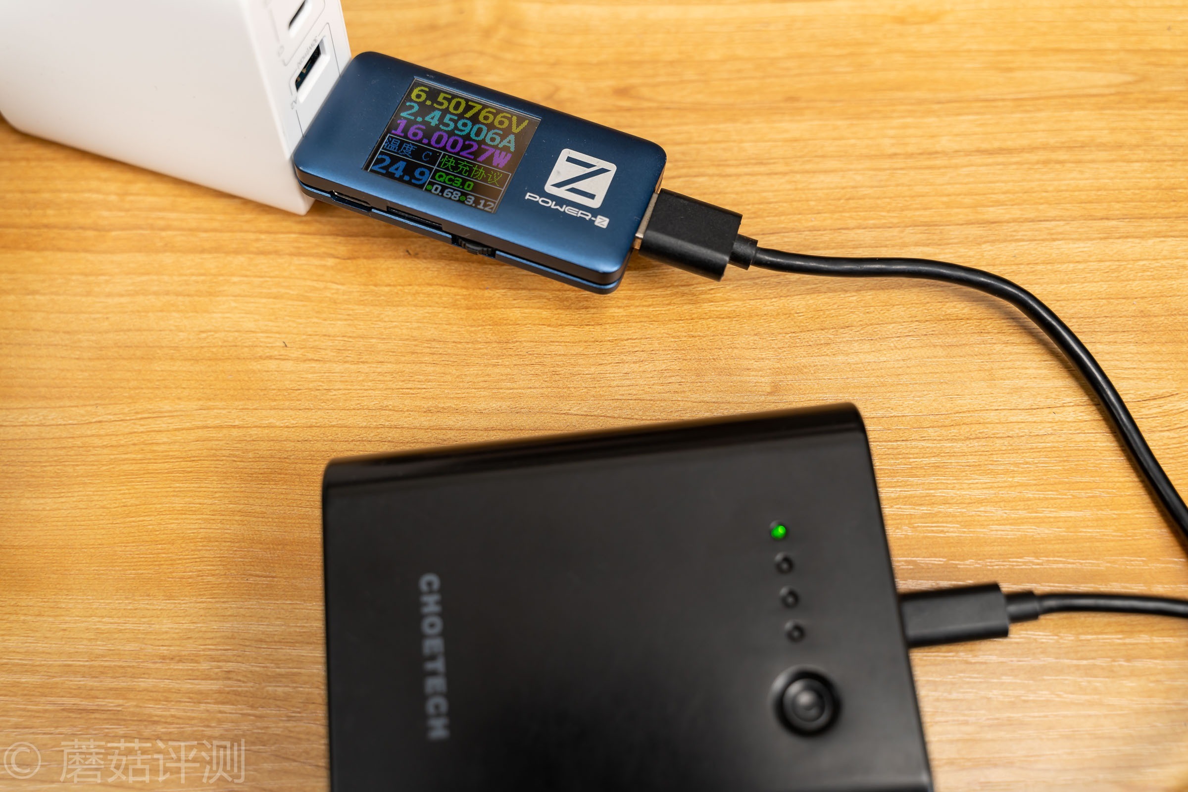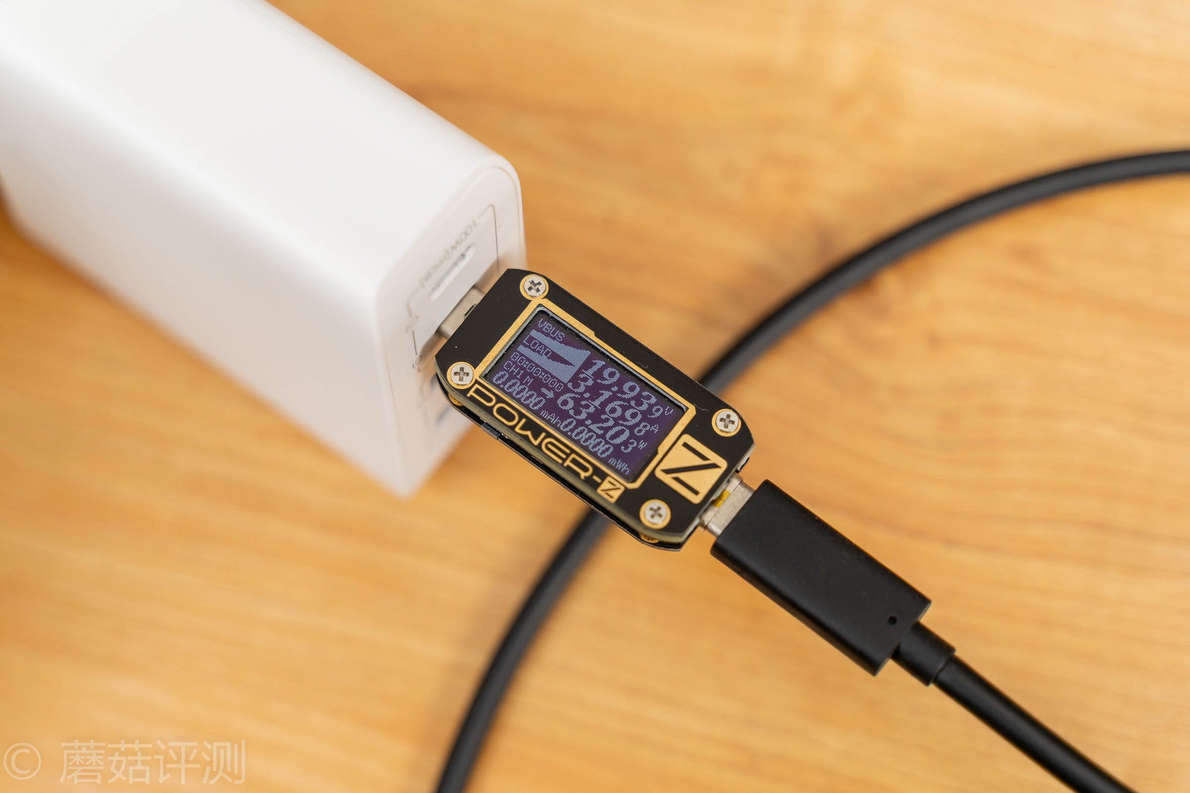 ▼实际充电测试,C1接口给蘑菇手里功率最大的移动电源充电,稳定输出63W。