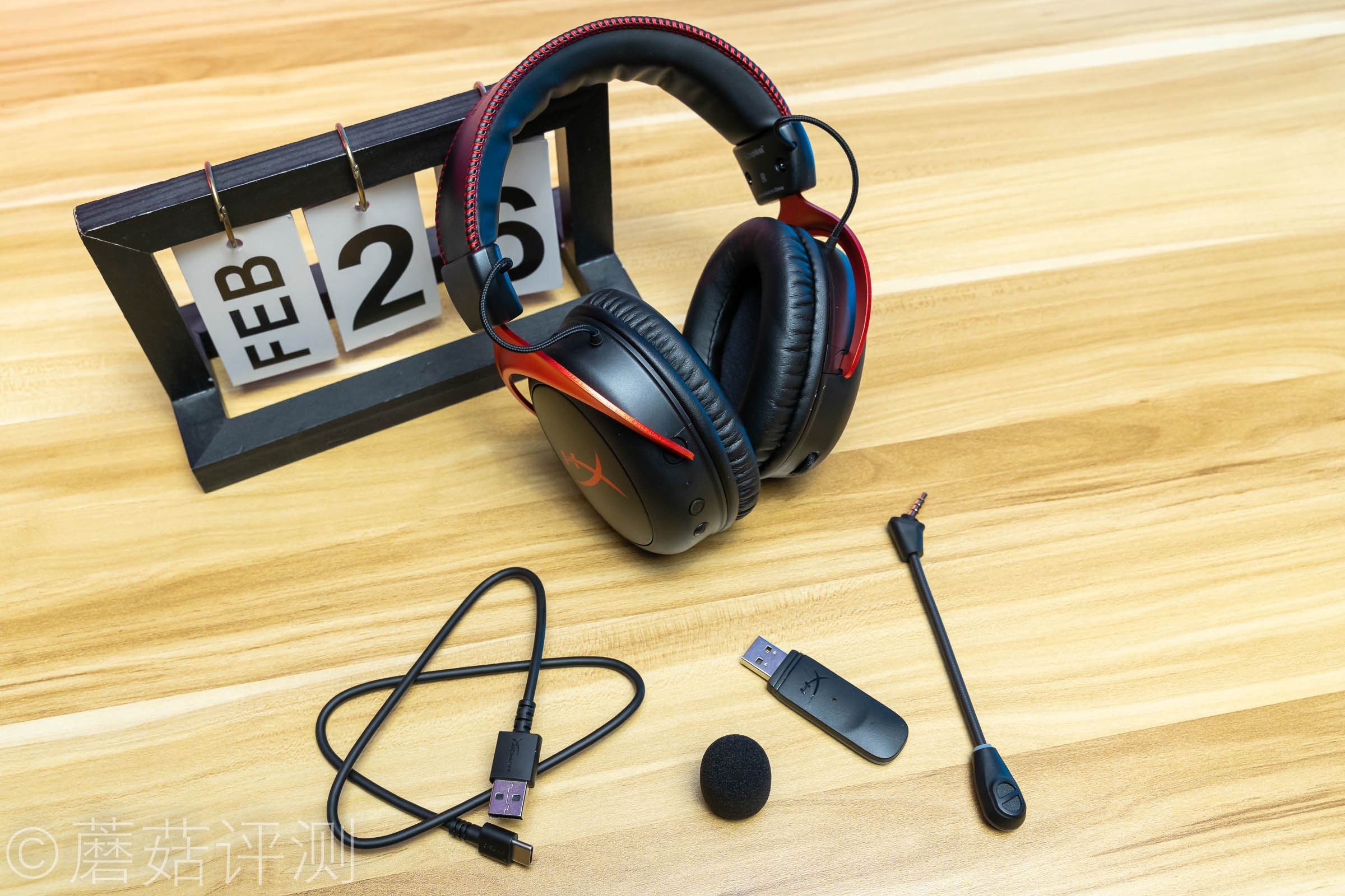 ▼将其余的说明性文件放一旁,包装里面的主要配件就这么几样,耳机、无线接收器、麦克风、充电线和防喷头。