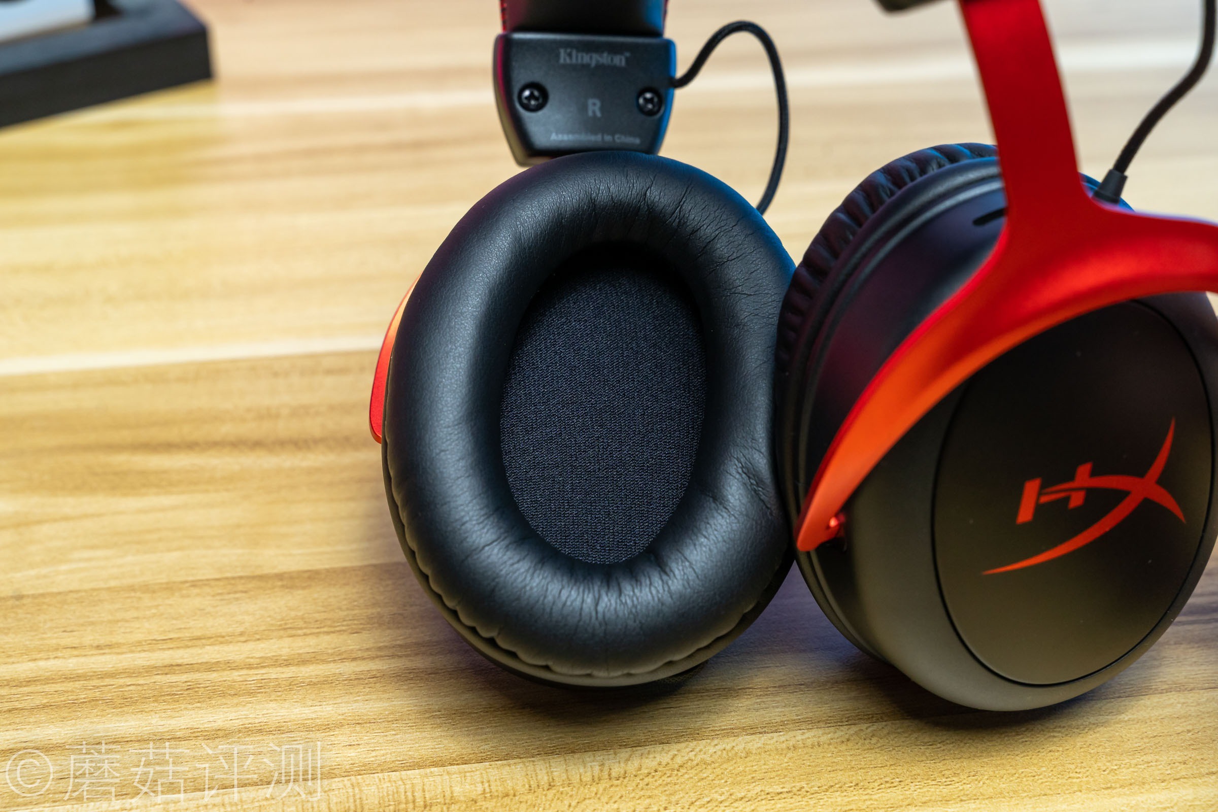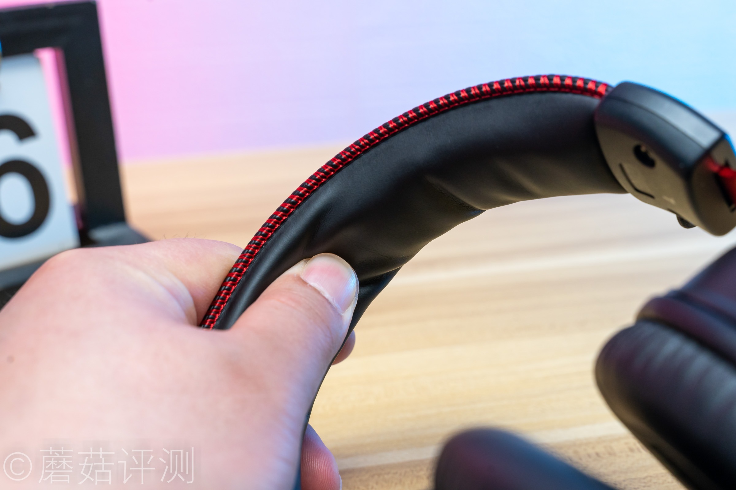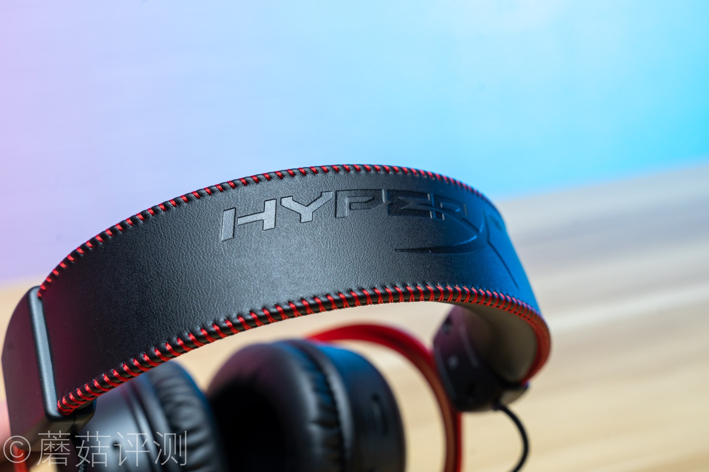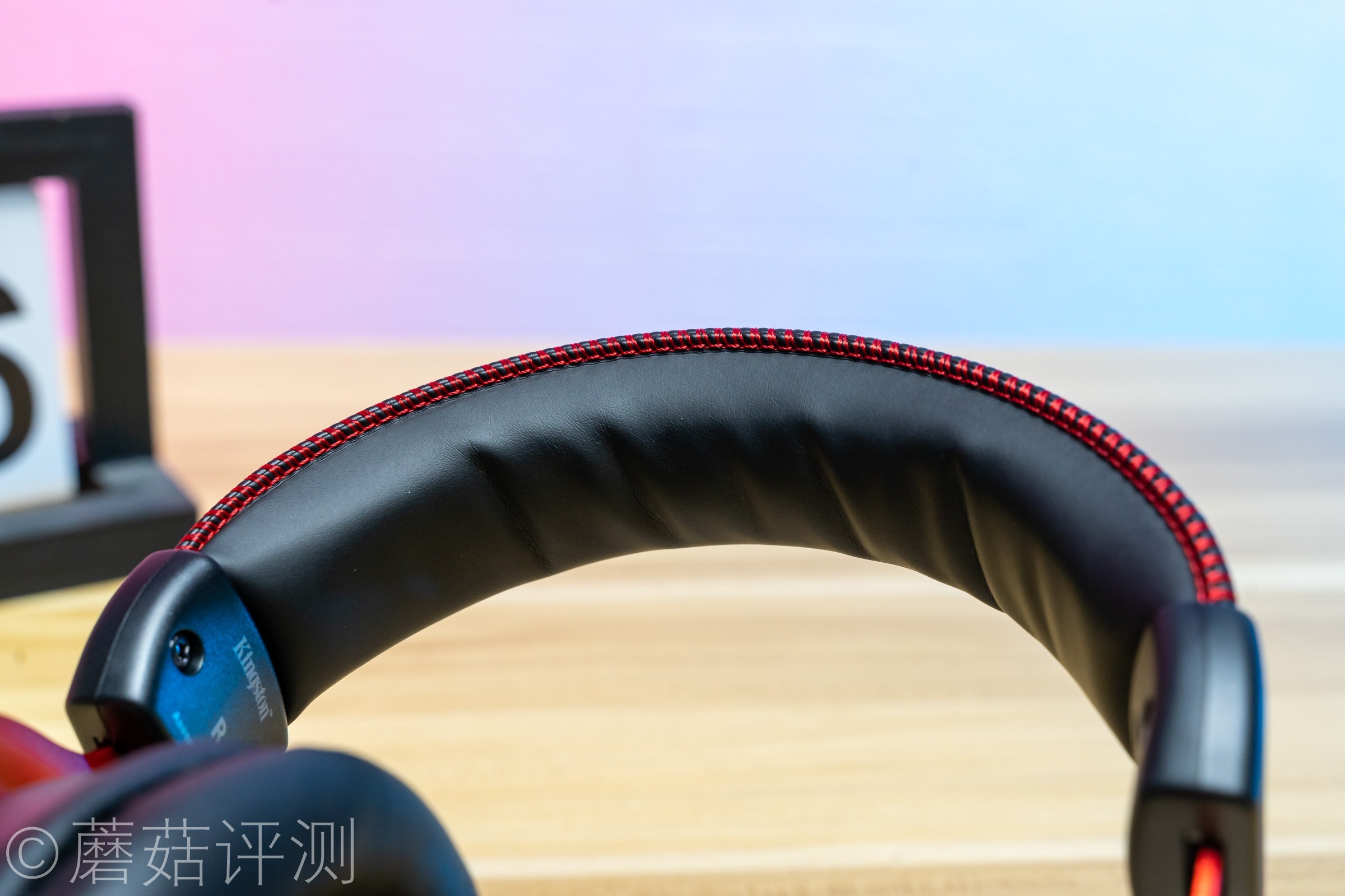 ▼耳机头梁顶部有硕大的HyperX的LOGO,同样是皮质的,两侧有红色的缝线,看着很漂亮。