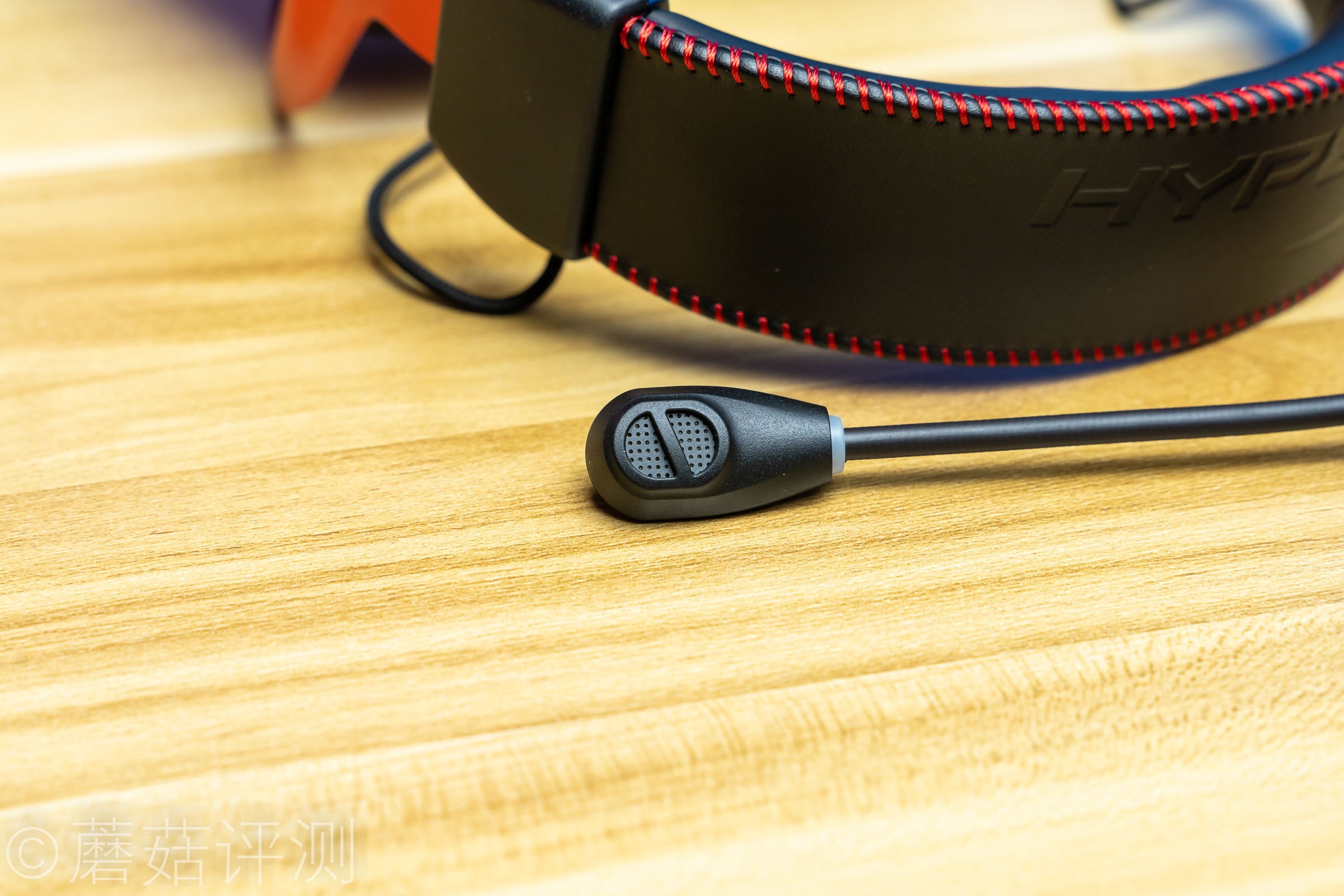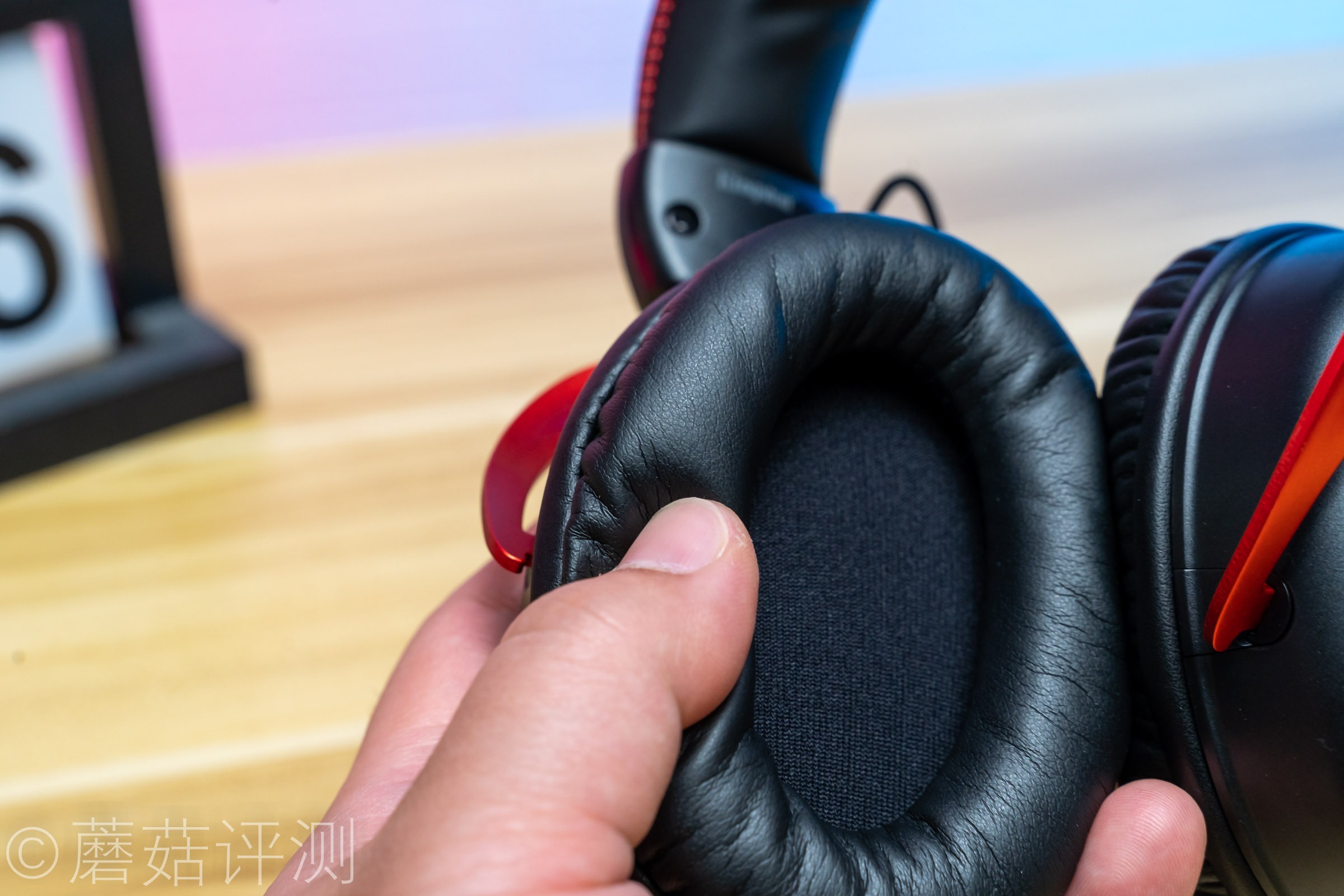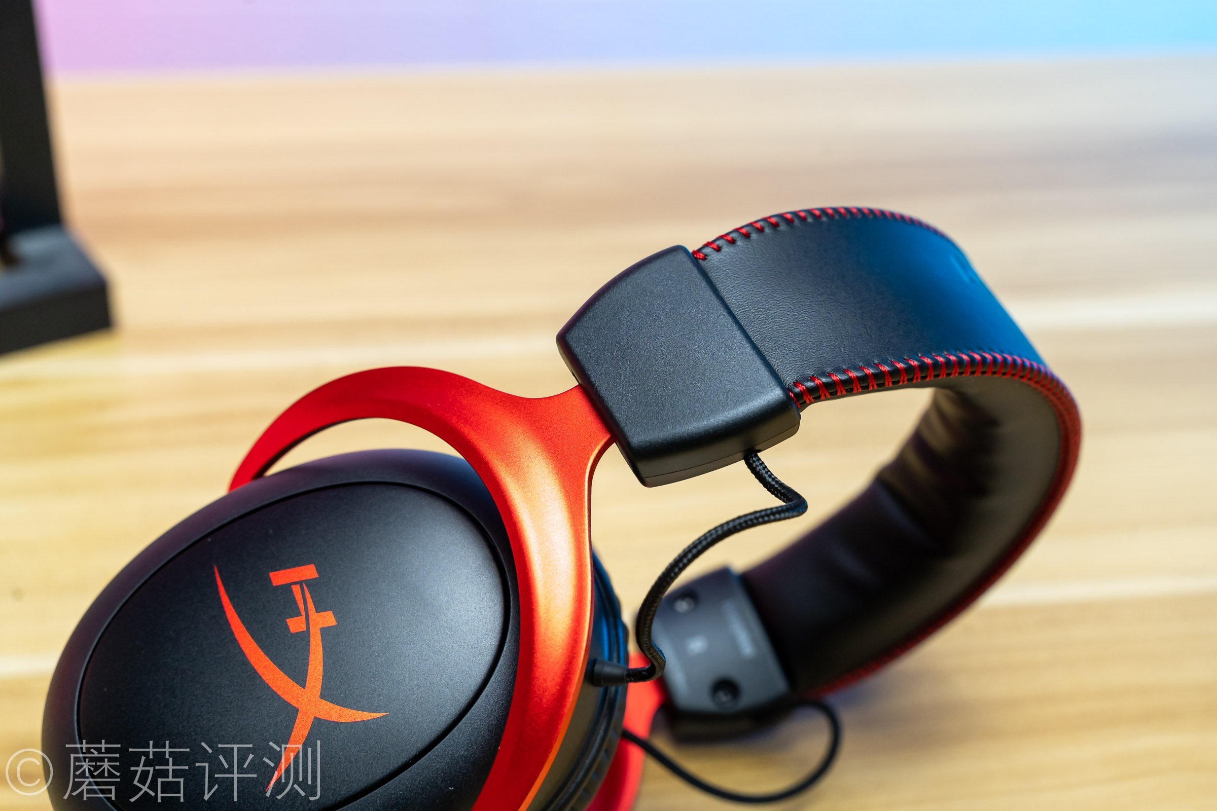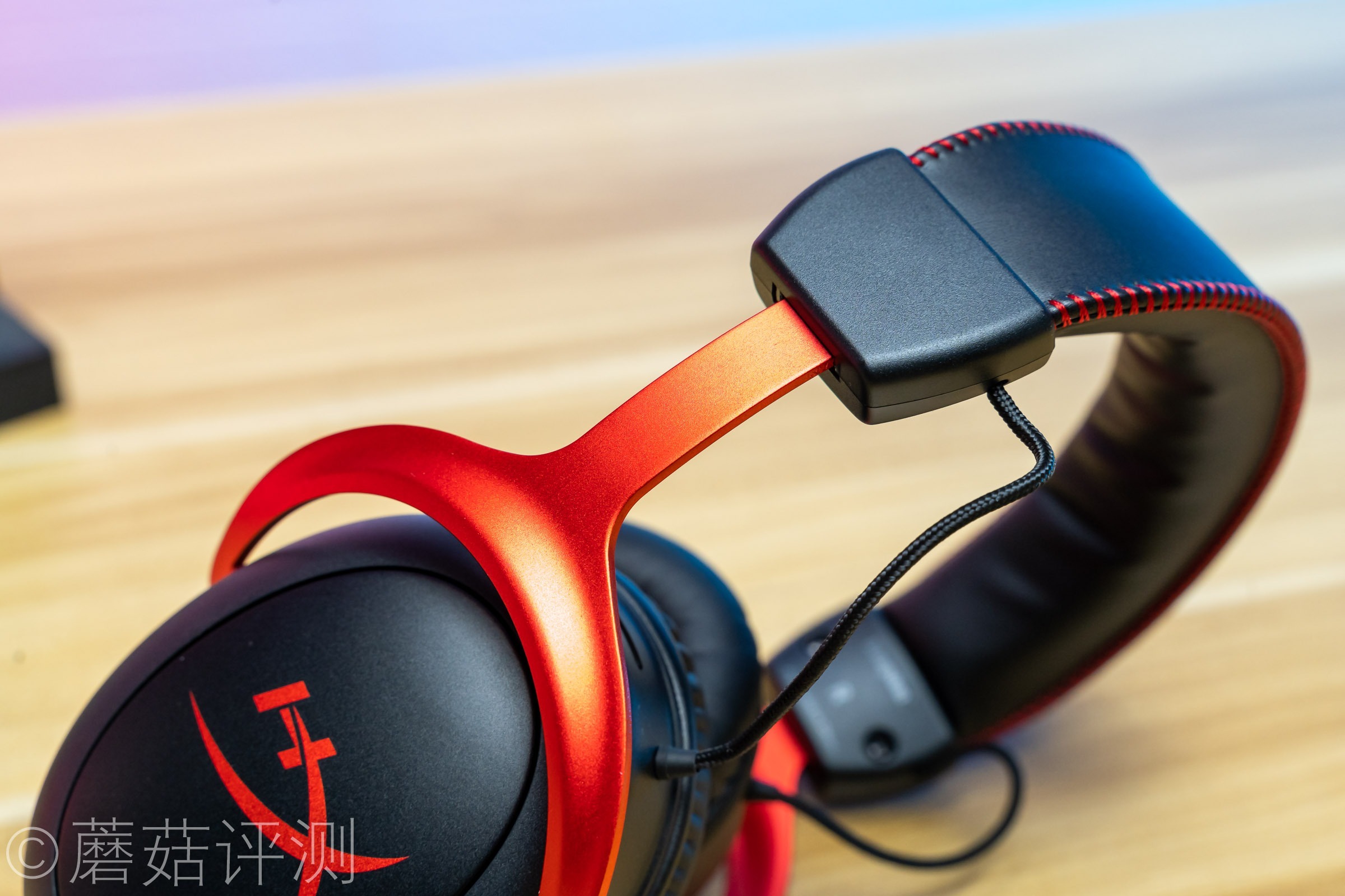 ▼耳机头梁顶部有硕大的HyperX的LOGO,同样是皮质的,两侧有红色的缝线,看着很漂亮。